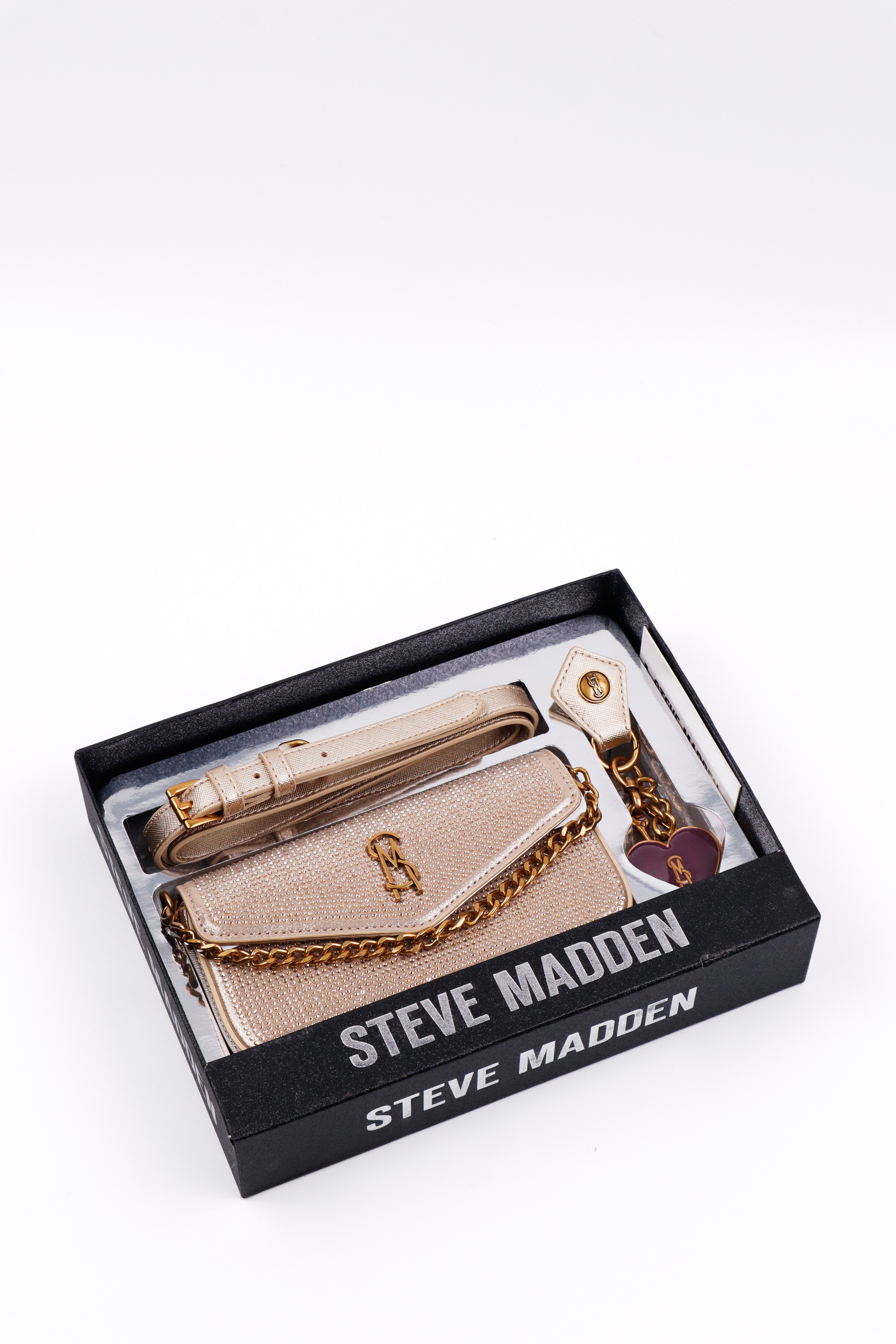 Add instant sparkle to your style with the Steve Madden BGLITZYG Gift Set. This stunning set features a rhinestone-embellished crossbody bag complete with a matching strap and a keychain accessory, making it the ultimate blend of elegance and edge.